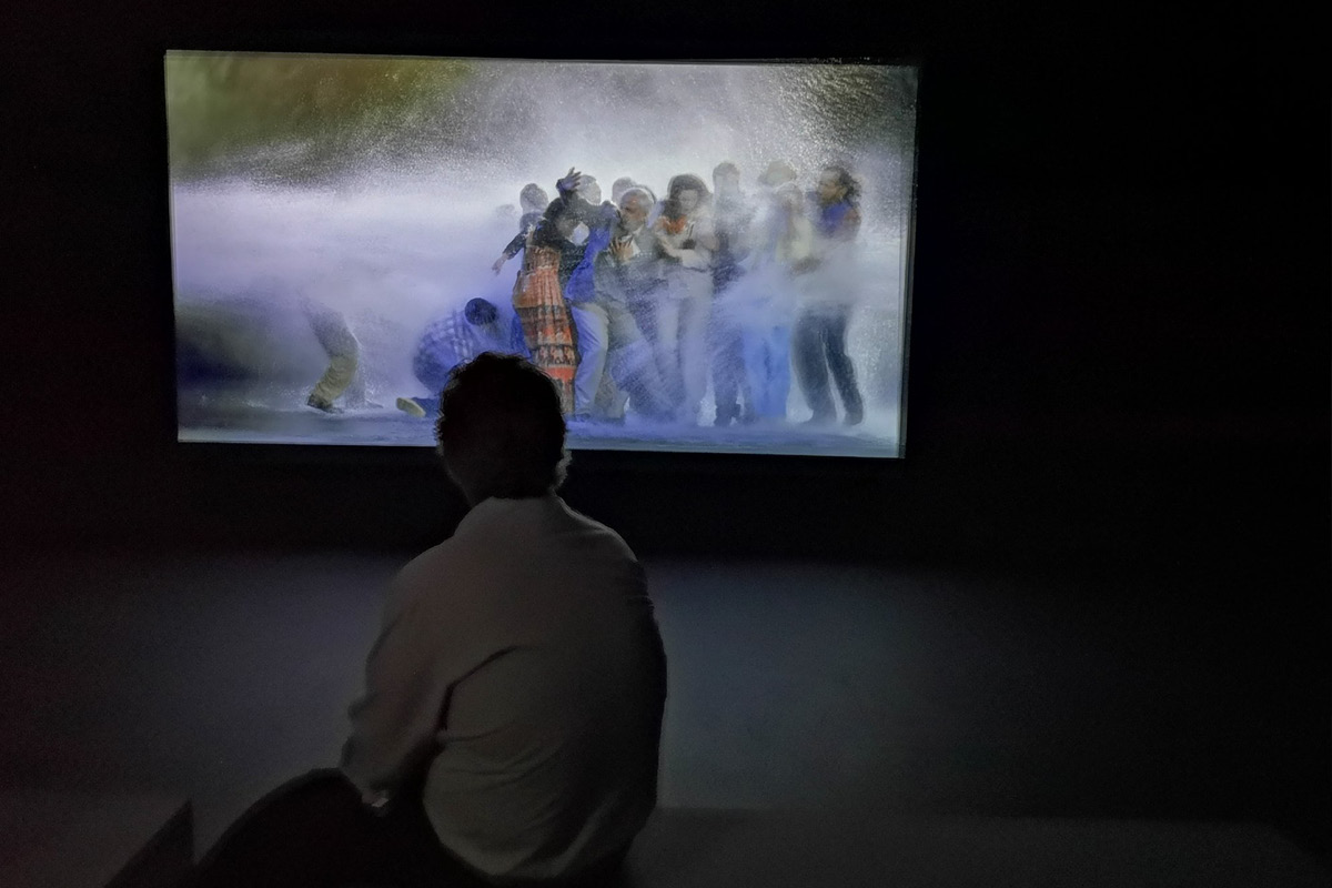The Raft è un’opera dello statunitense Bill Viola, considerato uno dei massimi autori internazionali di videoarte. Diciannove persone riunite in maniera apparentemente casuale vengono travolte da un’onda, inattesa e fuori luogo. Le riprese di questo video del 2004 che dura 10 minuti sono state fatte in tempo reale, ma scorrono al rallentatore, mostrando la fisicità dell’acqua e la vulnerabilità resistente delle persone investite dalla sua massa inesorabile e fragorosa.