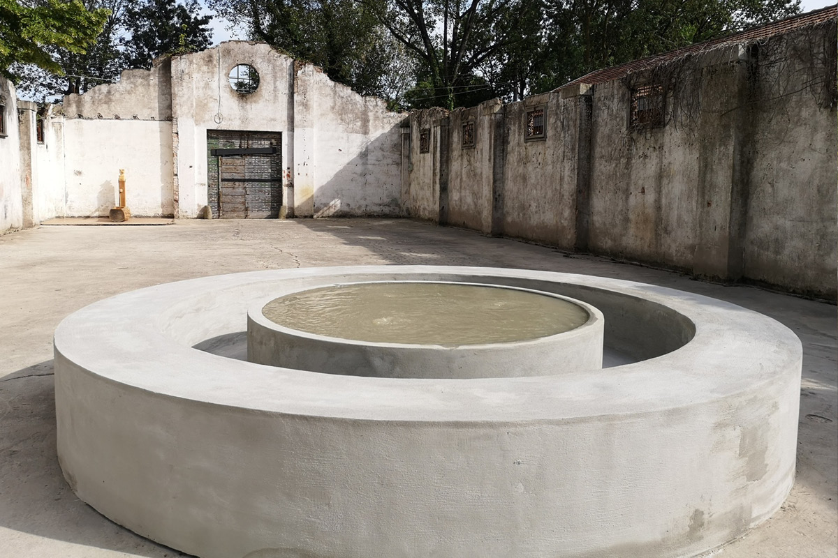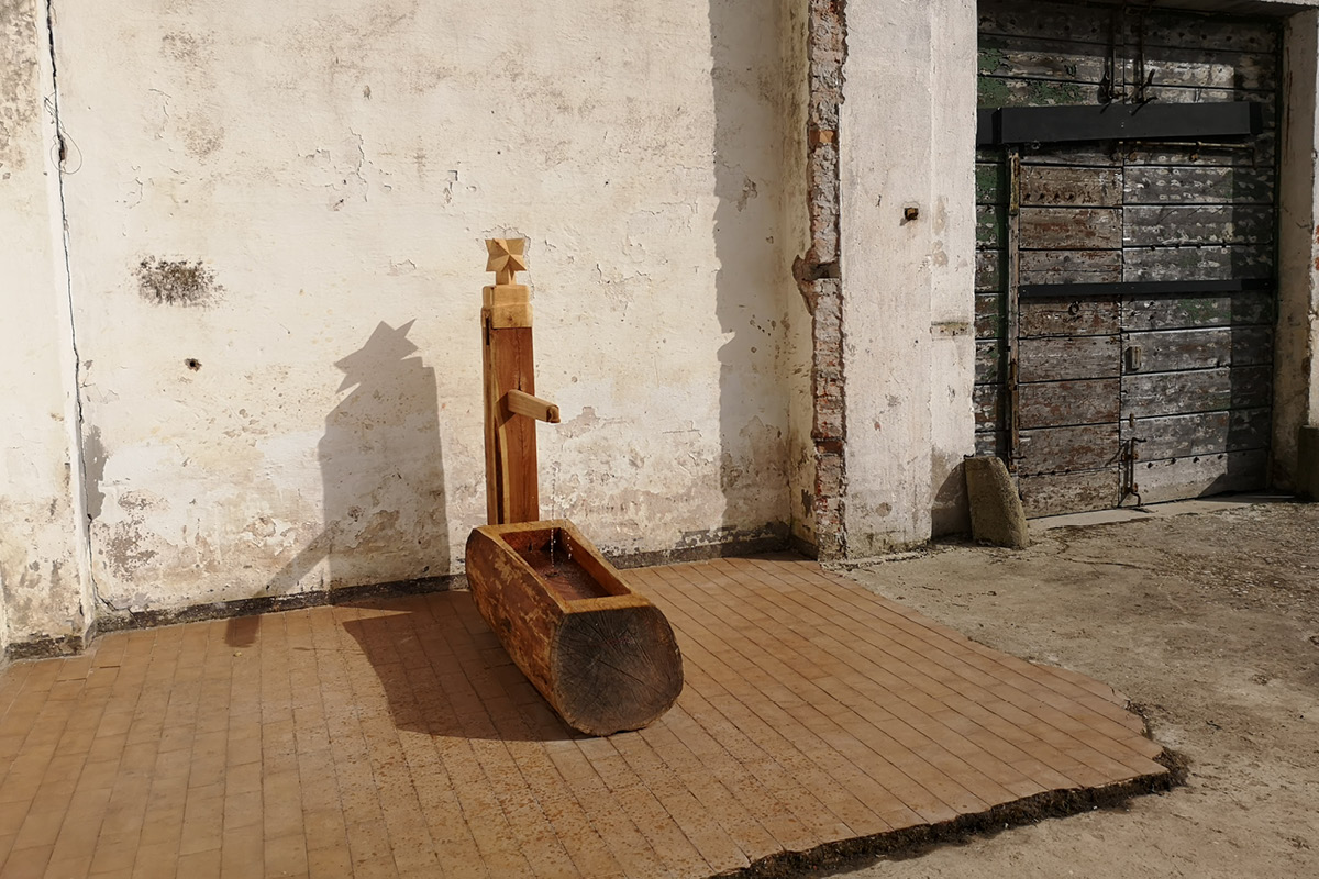Le fontane sculture di Massimo Bartolini trovano posto in una tesa senza copertura, dove l’artista ha collocato le sue opere con l’intenzione di abitare lo spazio e costruire un sistema di relazioni tra socialità e ritualità attraverso e grazie all’acqua, che qui è quella della laguna veneziana, con la sua temporalità, le sue stagioni, i suoi riti sociali. La tesa ha perso il tetto, ma ha mantenuto il suo perimetro, entro il quale l’elemento acquatico va a costruire uno spazio di incontro e condivisione.